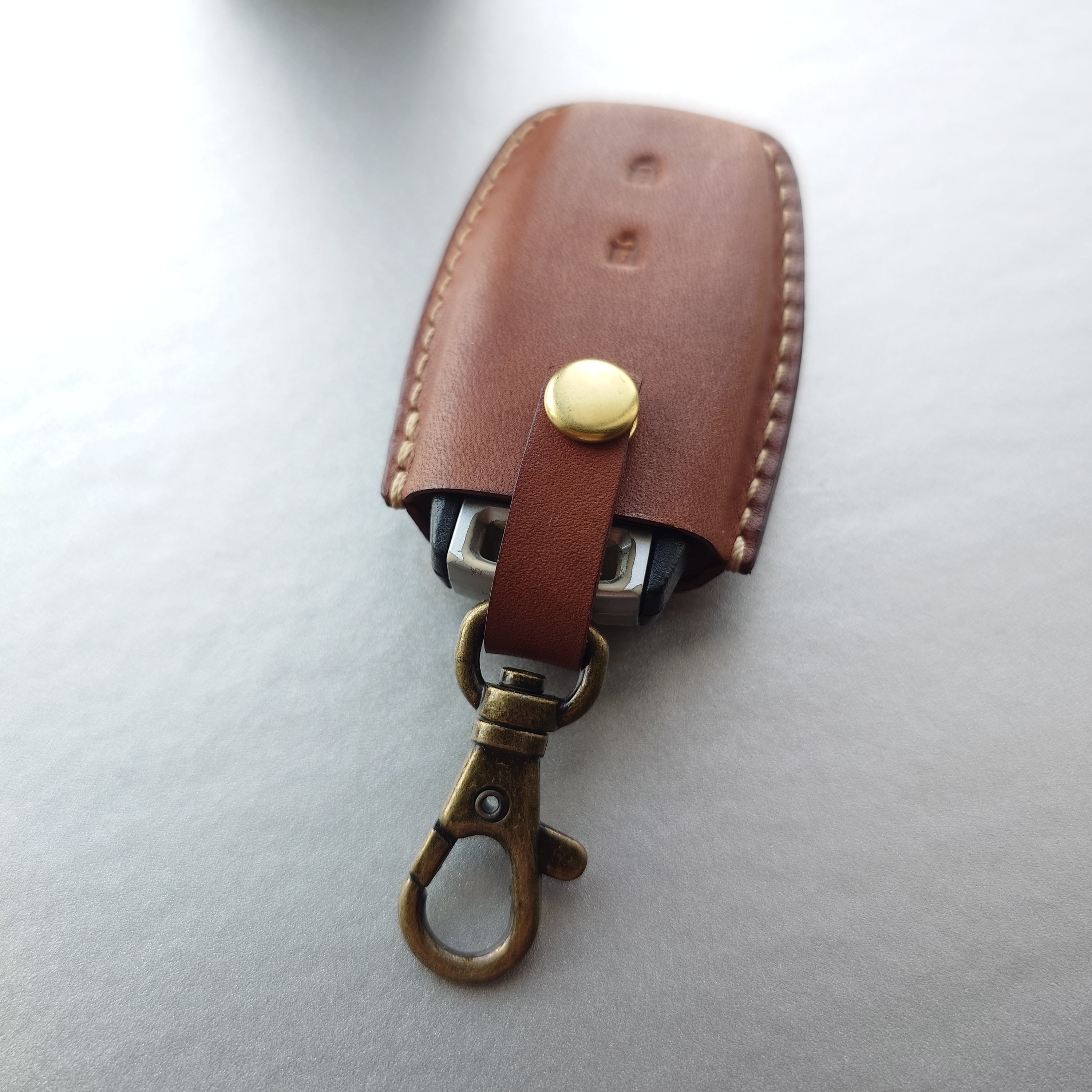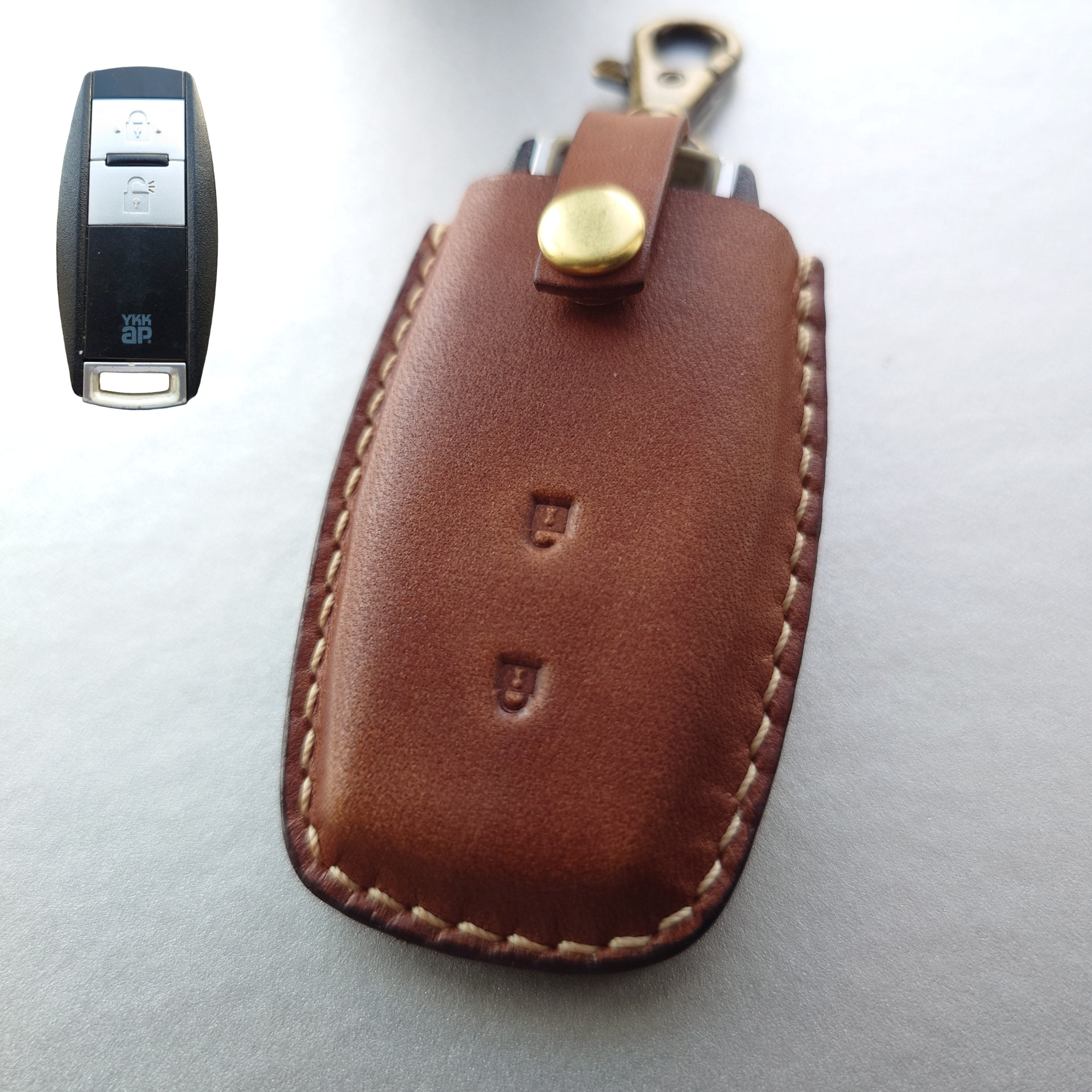 サドルレザー(ヌメ革)を使用して製作したYKKの玄関用ドアのスマートキーカバーです。実際のスマートキーを使用して製作しているためピッタリとフィットしています。ジャストサイズなので使いやすく、「このスマートキーためだけに作られたスマートキーケース」という特別感があります。
