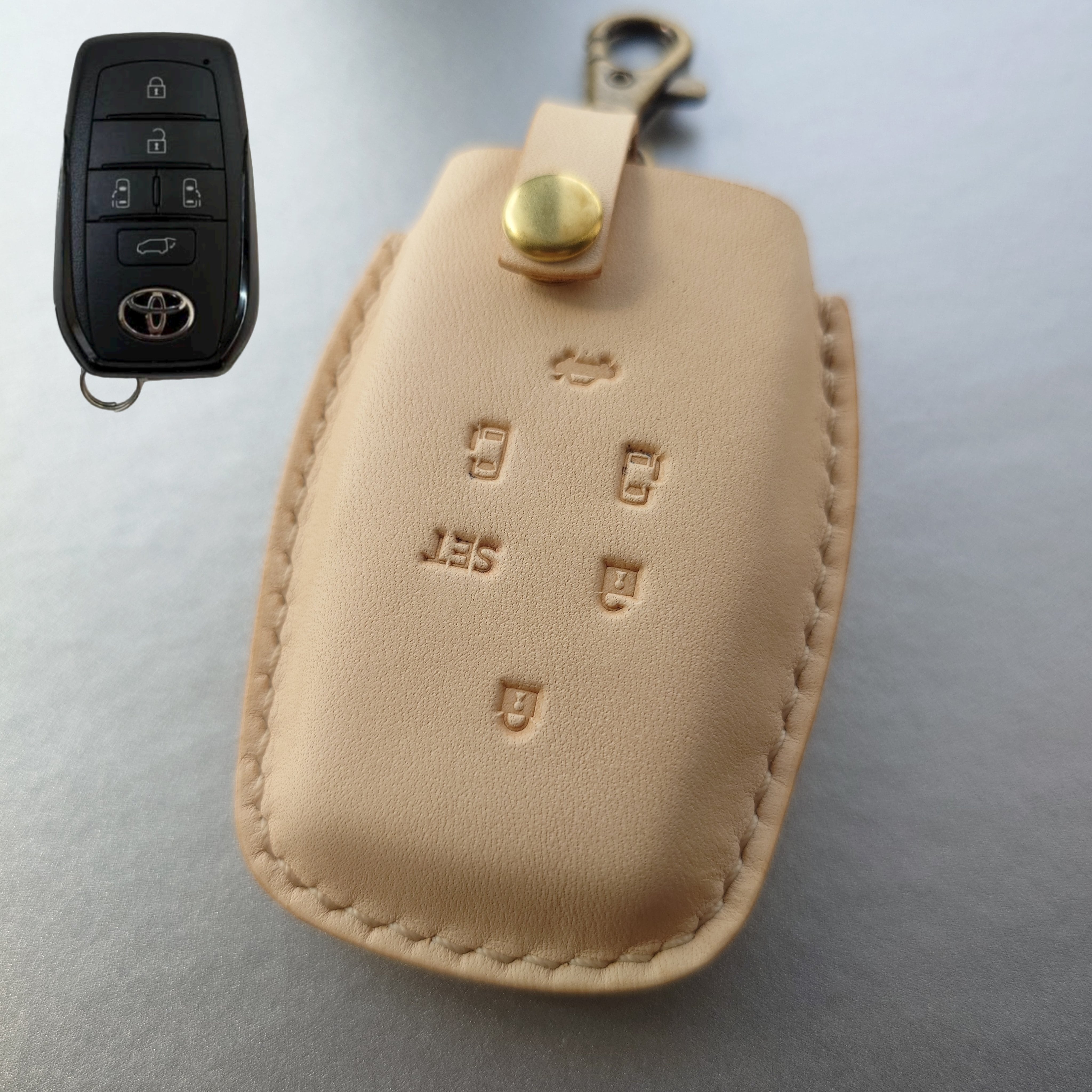 厳選したサドルレザー(ヌメ革)を使用して製作したトヨタのスマートキーカバーです。実際のスマートキーを使用して製作しているためピッタリとフィットしています。