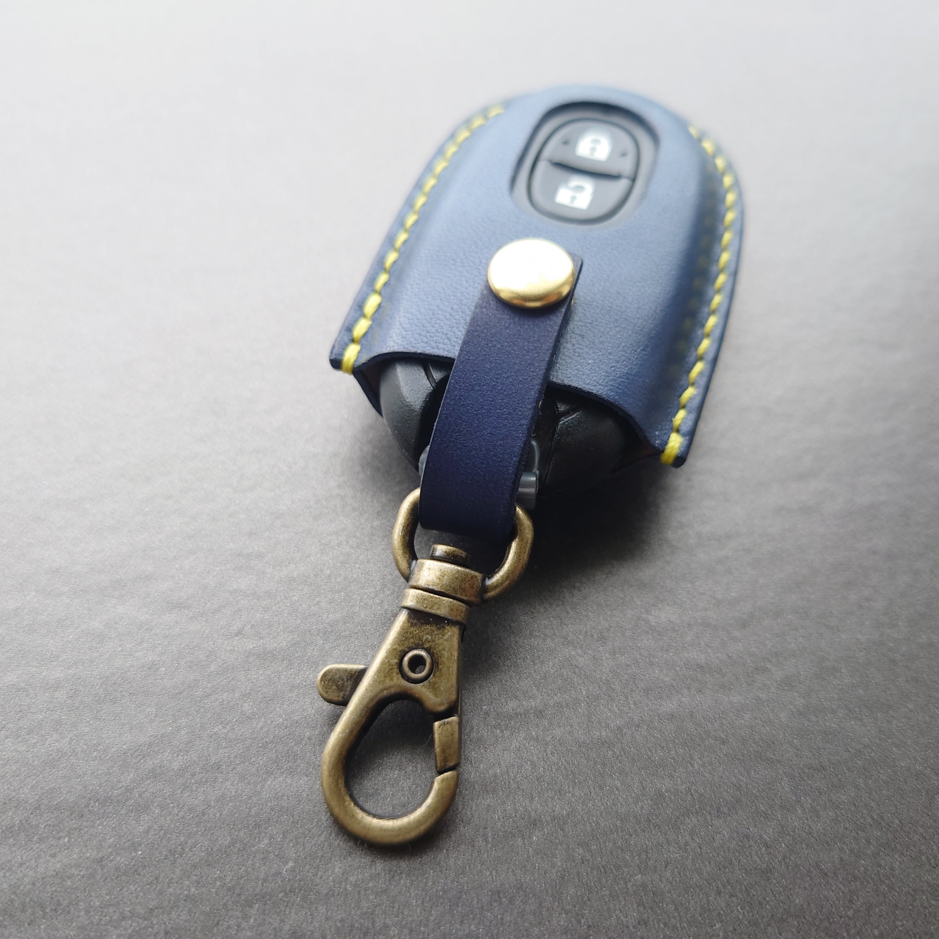 厳選したサドルレザー(ヌメ革)を使用して製作したスズキの軽自動車用のスマートキーカバーです。ホックやボタンを使用していませんが、通常の使用で抜け落ちることはありません。実際のスマートキーを使用して製作しているためピッタリとフィットしています。