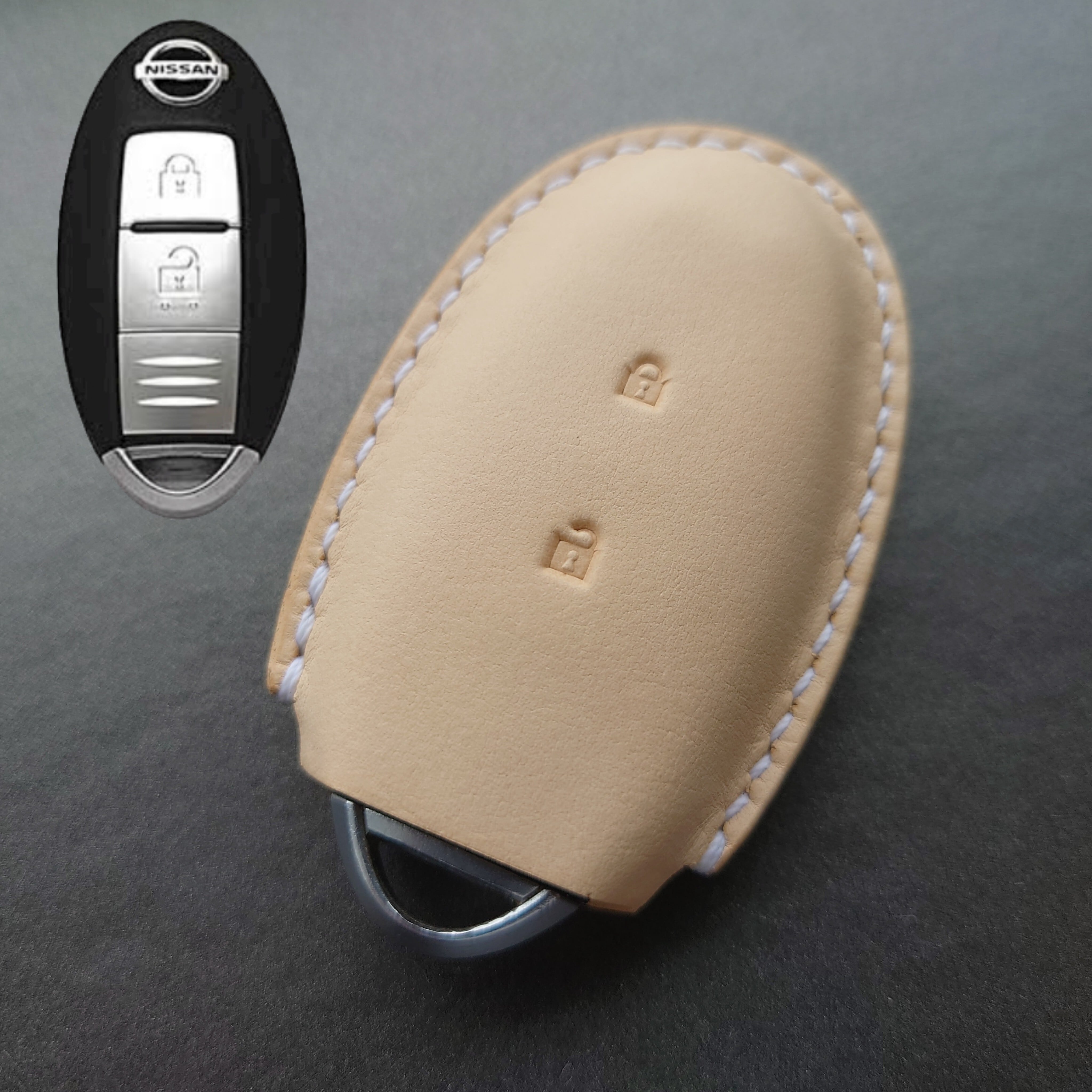 厳選したサドルレザー(ヌメ革)を使用して製作した日産のインテリジェントキー(スマートキー)カバーです。ホックやボタンを使用していませんが、通常の使用で抜け落ちることはありません。実際のスマートキーを使用して製作しているためピッタリとフィットしています。